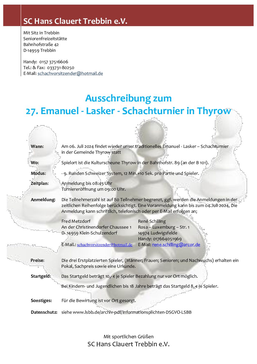 Zudem soll das schachliche und kulturelle Erbe von Emanuel Lasker, dem einzigen deutschen Schachweltmeister bewahrt werden.