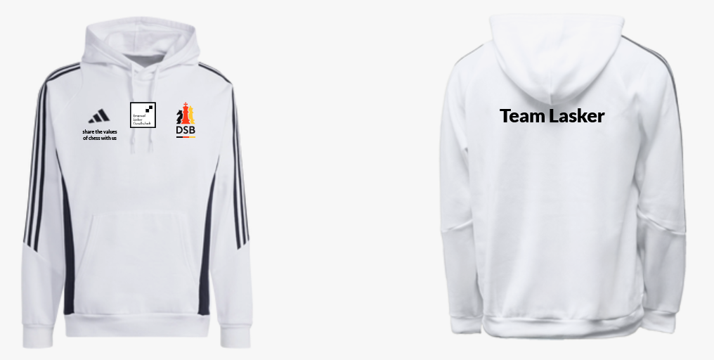 Wer mit uns aktiv das Schach als Kultur- und Bildungsgut fördern möchte, ist herzlich eingeladen, der ELG im Jubiläumsjahr als Mitglied beizutreten -falls noch nicht geschehen- oder uns mit einer Spende zu unterstützen. Als besondere Jubiläumspräsente haben wir ferner zum einen den sog. ELG-Jubiläums-Turm kreiert, der für 12,- €/Stück plus Versandkosten bei uns bestellt werden kann, sowie zum anderen eine eigene Variante des DSB-Hoodys mit ELG-Logo und unserem Slogan „share the values of chess with us“ entworfen, der über uns bei 11teamsports zum Preis von 64,00 €/Stück plus Versandkosten bestellt werden kann. Die Erlöse daraus fließen voll in unsere Projekte. Diese beiden Angebote gibt es exklusiv nur in diesem Jahr.